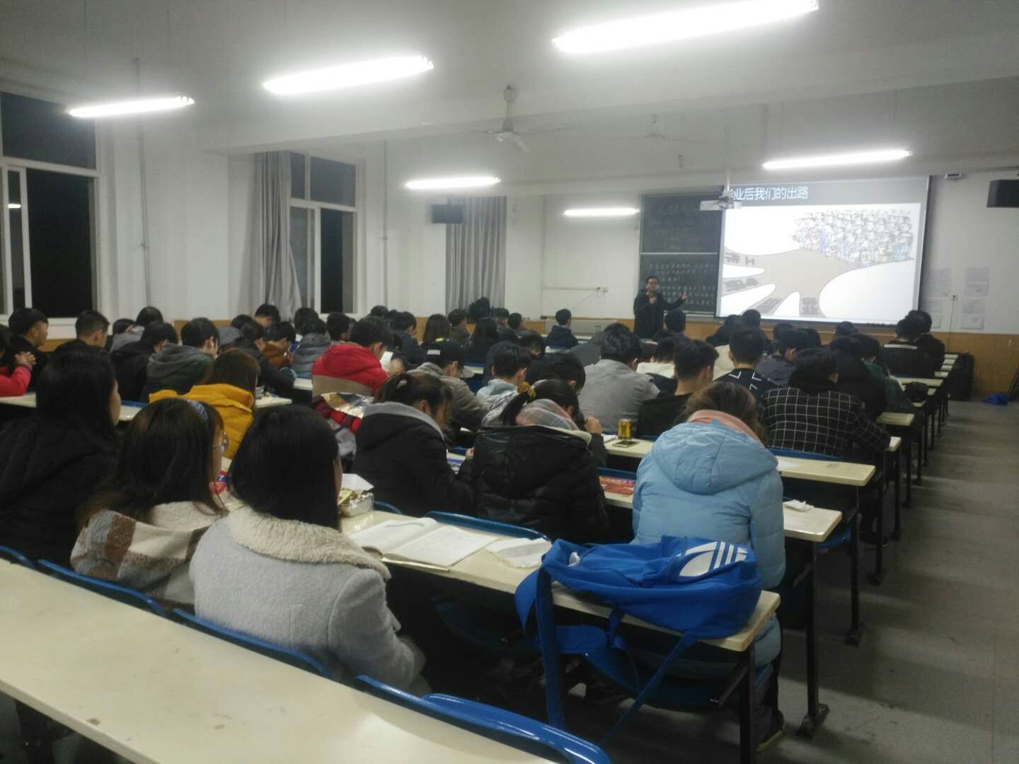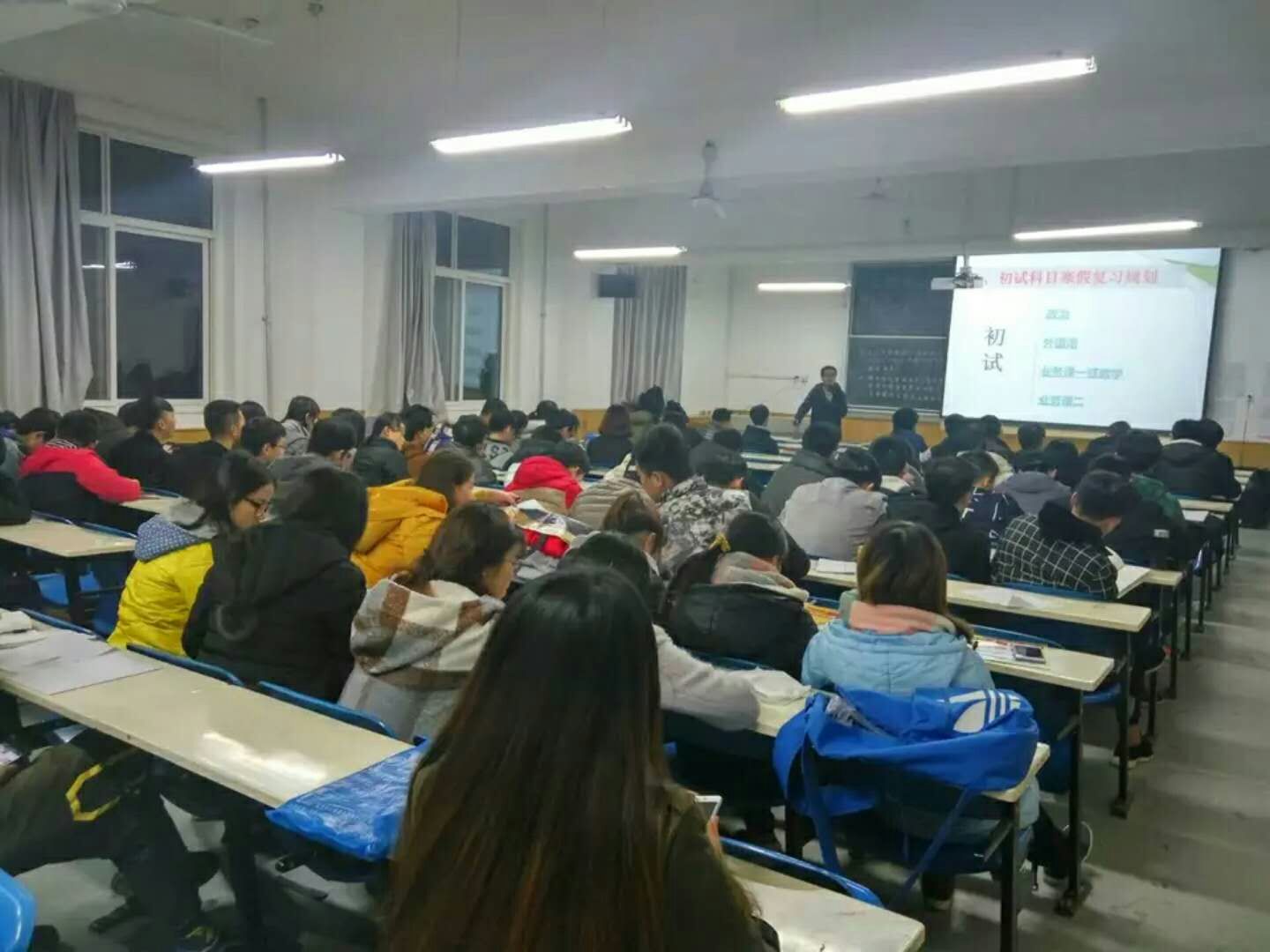 讲座开始,首先考研讲师梁老师为到场的同学们分发了各科考研历年真题以及考研寒假规划作业,让同学们以实际出发了解考研题型。之后王老师微笑的走进教室,就今年考研人数趋势以及考研中实际竞争对手数量进行了分析,他表示虽然近年来考研人数日益剧增,但只要同学们意志坚定,以正确的态度对待考研,还是很有可能达到自己的目标。紧接着王老师就如何复习进行分享,他建议同学们复习的时候可以接触几位和自己同样目标学长,这要不仅可以在以后读研时有所关照,而且还可以了解更多有关考研复习的心得。