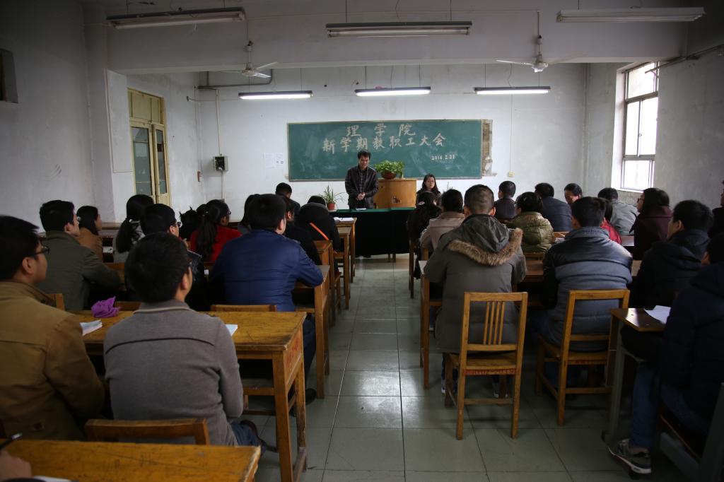 岳忠玉在会上传达了“2016年寒假工作会议”上党委书记陈平社所作的《全省教育工作会议精神》,全面解读了院长陈万强提出的“五个二”------两翼齐飞、两个特色、两个支撑、两个核心、两项评估等寒假干部会议精神,以及beat365英国官方网站2016年工作要点。他要求广大教师要认真领会陈院长和陈书记的讲话精神,充分认识学校发展中所面临的形势和任务,加大师资队伍建设力度,做好数学类和物理类本科基础课程的课程建设,凝聚学科方向,搭建科研平台,组建科研团队,以学校推行和加强“校院二级管理”为契机,秉承“教授治学、民主办院”的理念,建立健全beat365英国官方网站规章制度,完善激励约束机制,逐步形成“仁人和合、务实尚理、人尽其材、各美其美”的学院文化,切实做好学校各项工作。