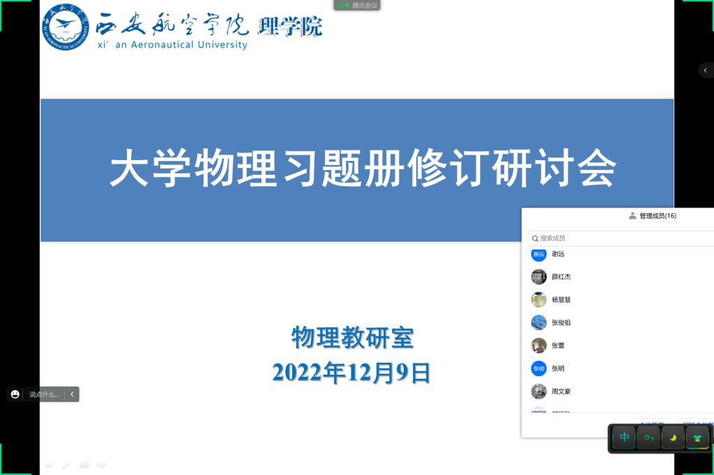 会上,各位老师就大学物理习题册中每一章节内容存在的问题和不足轮流发言,查漏补缺、更改错误,包括示意图错误、文字错误、公式编辑错误及内容摘要知识点缺少等,并结合学生实际,对习题册中不合适的题目进行了更新和删减。