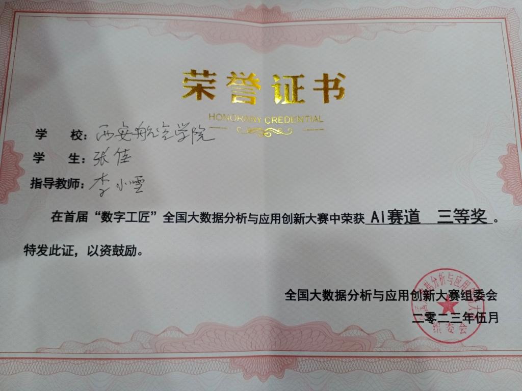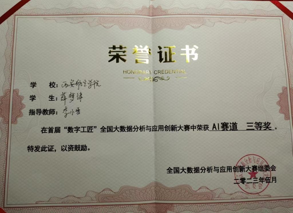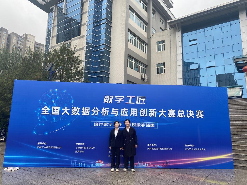 近日,由机械工业经济管理研究院指导,《智慧中国》杂志社、国声智库主办,西安理工大学、美林数据技术股份有限公司承办的首届“数字工匠”全国大数据分析与应用创新大赛总决赛在西安理工大学曲江校区顺利举行,经过激烈角逐,我院李小雪和王苗苗老师指导的信息计算202班薛梦津、张佳2名同学组成的“祺珩”队,荣获AI赛道全国三等奖。