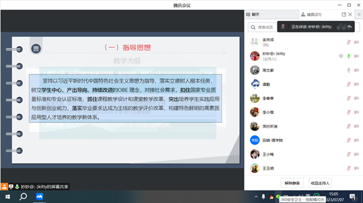 为进一步提高人才培养质量,加强课程思政建设,beat365英国官方网站物理教研室于2023年7月7日下午以线上会议方式,召开了2023版光电信息科学与工程专业教学大纲修订与编制研讨会。物理教研室全体成员参加了该会议,会议特邀了学院党总支书记胡红亮和丁琦副院长参加,金发成召集主持。