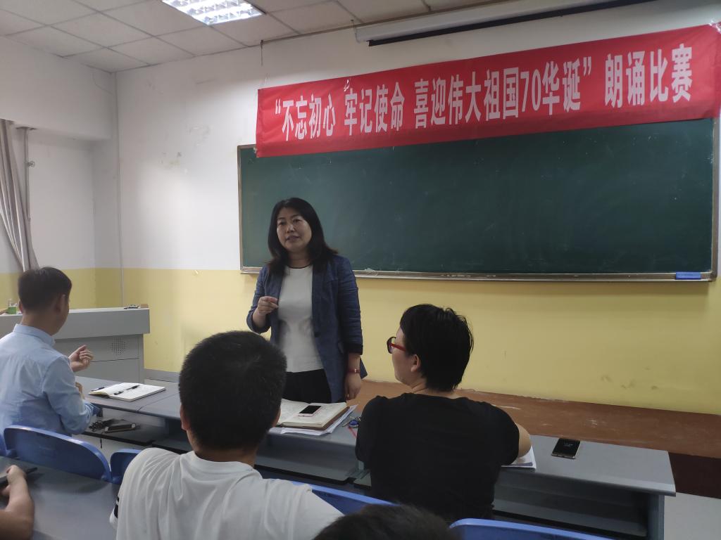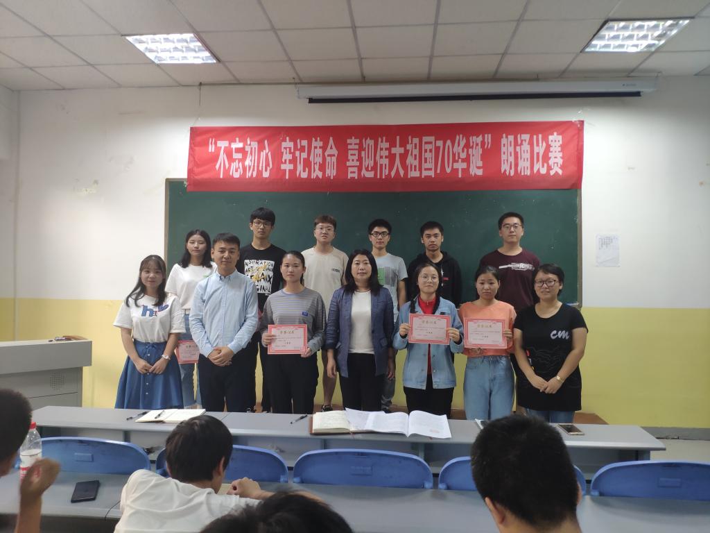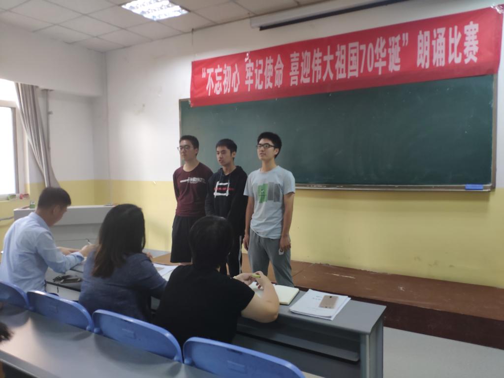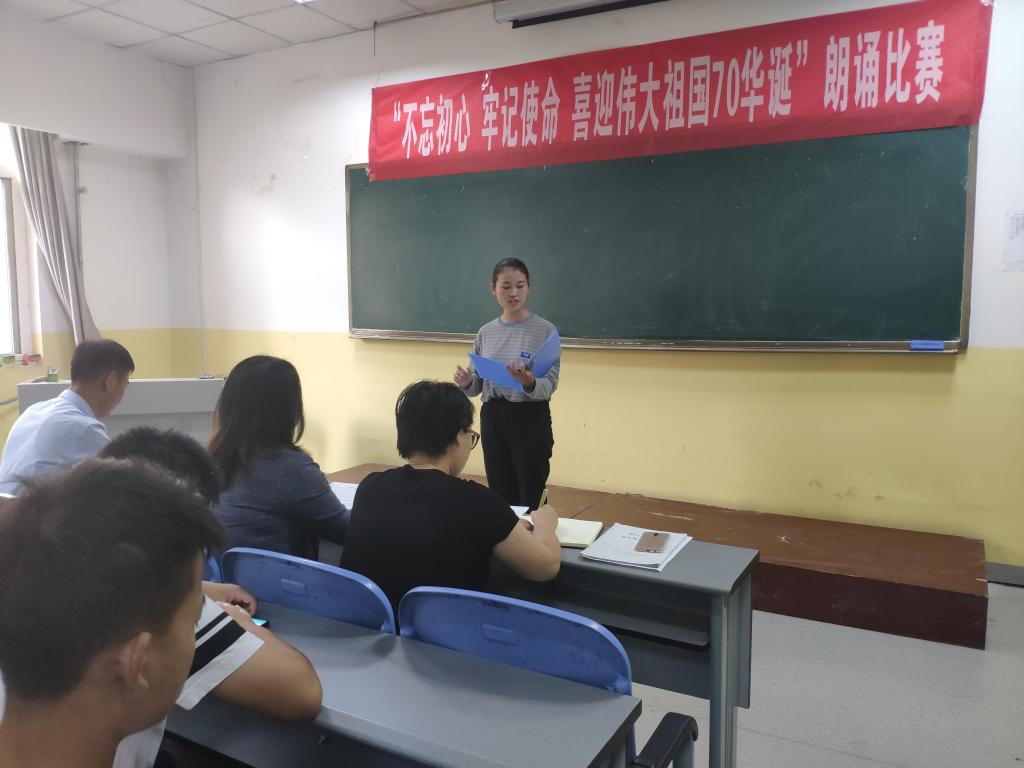 为庆祝中华人民共和国成立70周年,加强对学生爱国主义教育,2019年9月26号至29号,beat365英国官方网站在南楼408举办了“不忘初心,牢记使命,喜迎伟大祖国70华诞”主题朗诵大赛。beat365英国官方网站各班级均派出学生代表参加,共12支代表队参加了比赛。朗诵大赛评委为beat365英国官方网站党总支书记李小光、学生管理科科长李扬,团总支书记杨陈东及学生会部分干部。观众为所有大一新生。