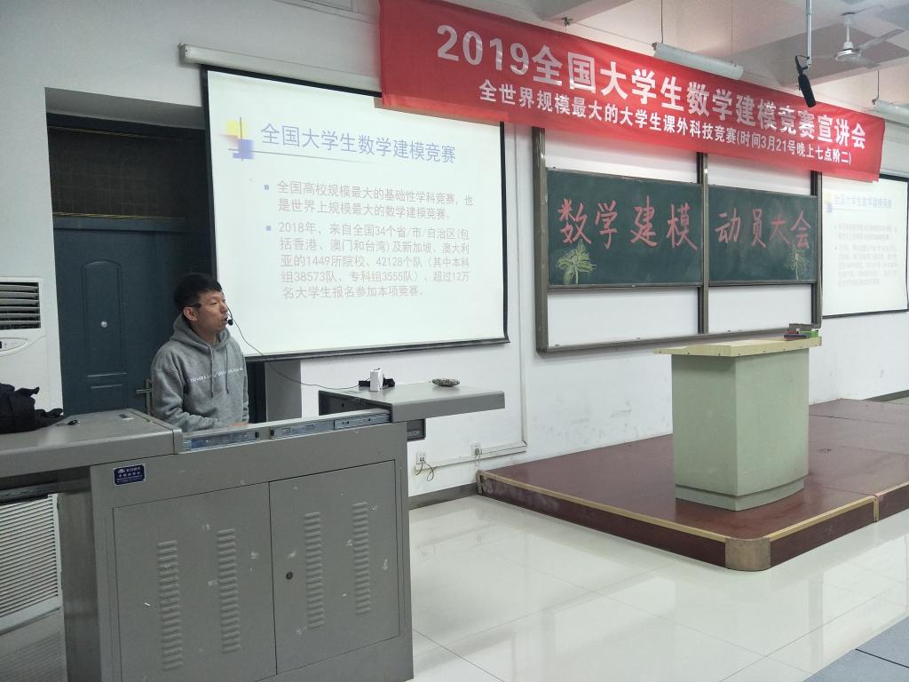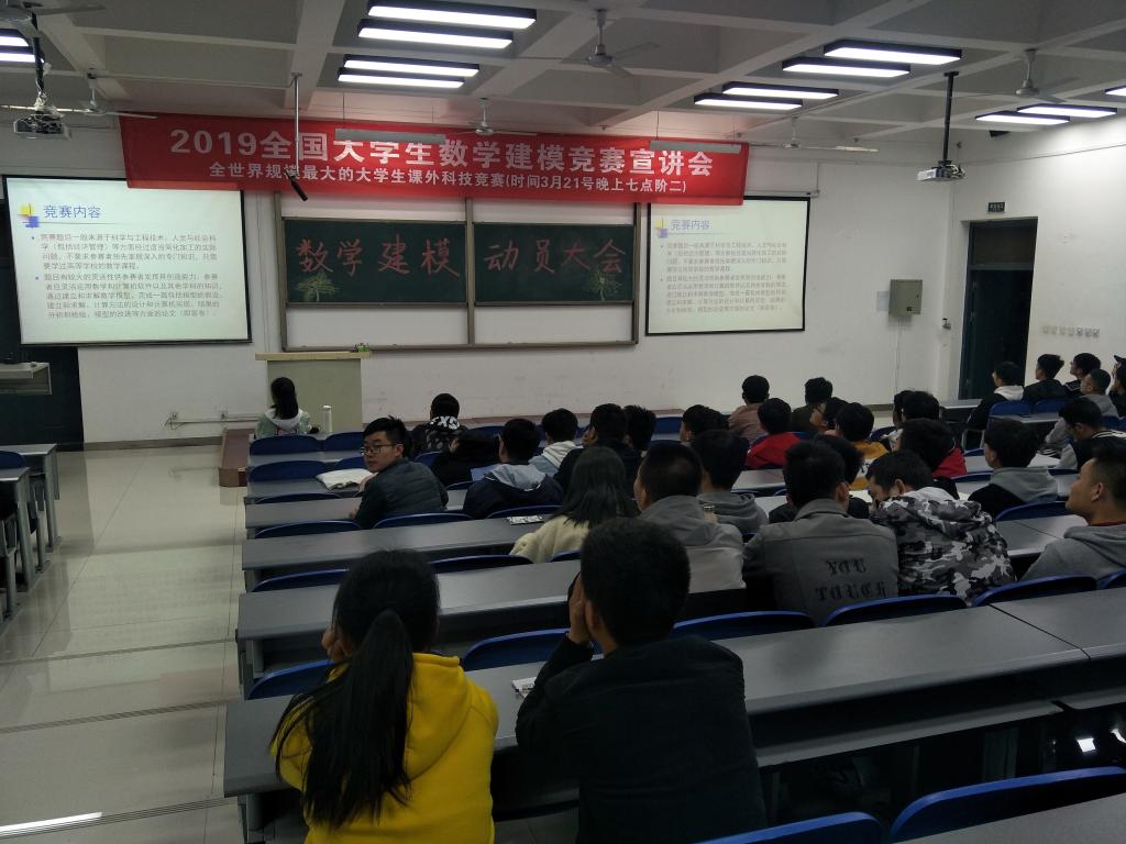 beat365英国官方网站团总支数学建模协会经过半个月左右的宣传和精心准备,2019年3月21号晚上7点,由beat365英国官方网站举办,数学建模协会承办的“2019年全国大学生数学建模竞赛宣讲会”在阶梯二顺利举行,本次宣讲会座由数学建模竞赛负责人张蒙老师主持。
