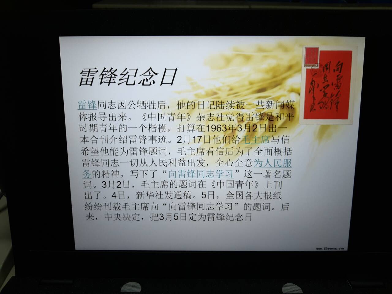 班会上,青年志愿者部李和庆为大家介绍了雷锋同志的生平事迹,学习了雷锋的名言及精神。李和庆深情解说,仿佛将同学们带回到了那个年代,也使同学们体会到雷锋精神对于构建和谐社会的价值及意义。