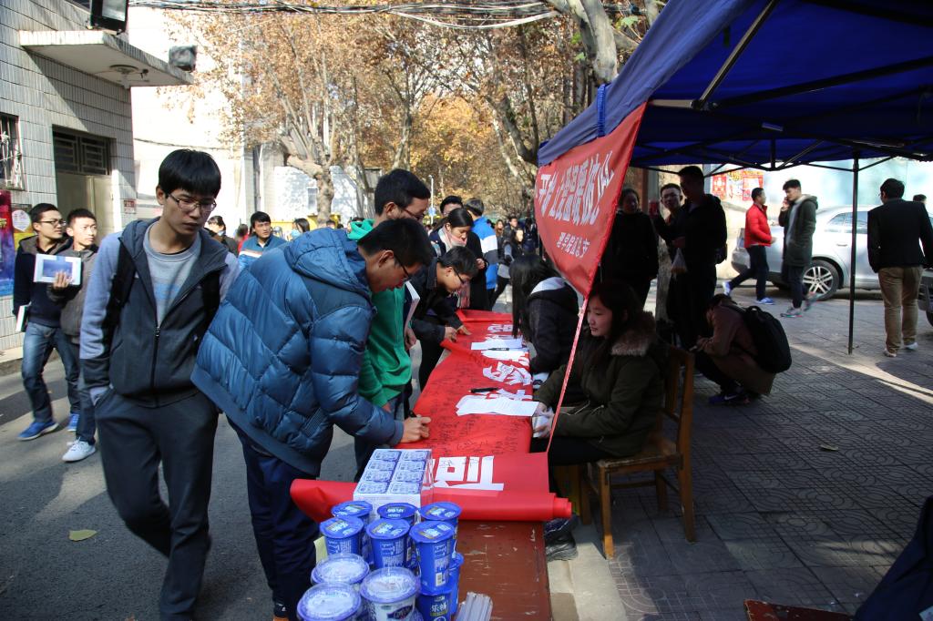 为此,beat365英国官方网站于2015年11月26日感恩节在二号食堂门口举办感恩节签名活动。上午十点,beat365英国官方网站团总支副书记朱宗贵组织beat365英国官方网站团总支人员悬挂感恩节宣传横幅,并在此现场征集感恩语。中午,beat365英国官方网站学生干部们组织过往同学在宣传感恩的横幅上签名,并向其宣传感恩知识,随后赠送纪念品。同学们积极参加此次活动,现场气氛火热但组织有序。