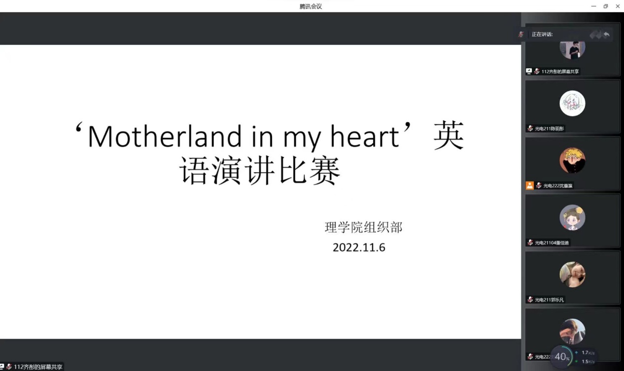为提高学生英语演讲水平,丰富同学们的课余生活,激发同学们的学习热情,2022年11月6日,beat365英国官方网站以线上形式组织了以‘The motherland in my heart’为主题的英语演讲比赛,beat365英国官方网站大一大二13名同学参加,活动由沈惠瀛主持。