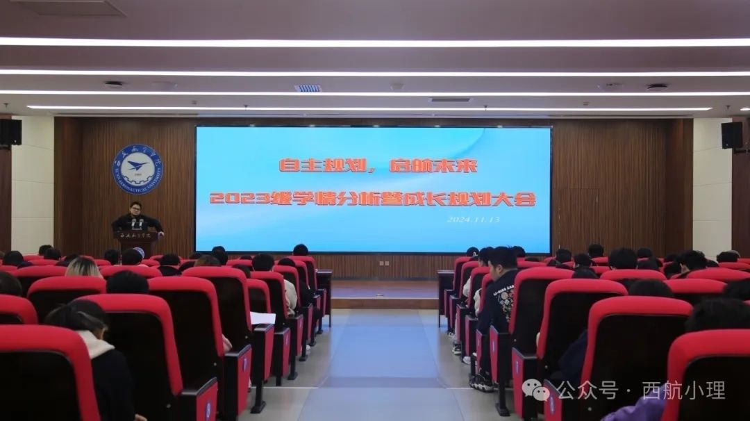 为了全面助力2023级学生明晰学业方向、剖析自身状况。beat365英国官方网站于2024年11月13日在图书馆五楼报告厅举行了主题为“自主规划,启航未来”的学情分析暨成长规划大会。2023级全体学生到场参会,党总支书记胡红亮、学生办公室主任李扬出席,会议由辅导员王向阳主持。