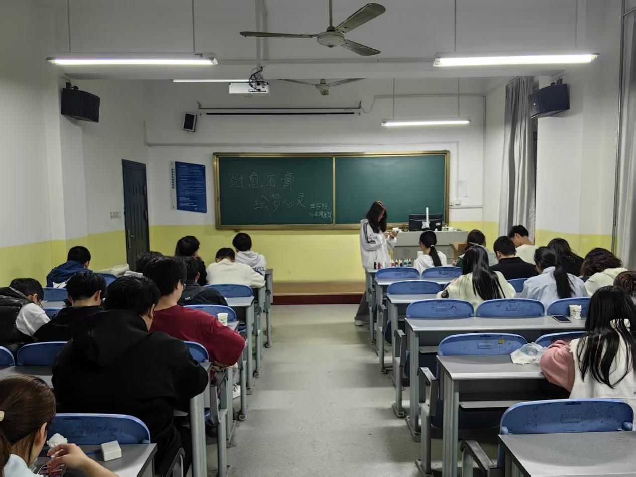 活动伊始,心理健康部康佳盼生动讲解了艺术创作对情绪调节的积极作用。随后,同学们充分发挥创意,运用多彩颜料在石膏娃娃上铺陈描绘。创作过程中,有的同学专注调色,层层晕染;有的精雕细琢,笔触细腻;还有的相互交流创作心得,现场氛围温馨融洽。经过近一小时的精心创作,40余件风格各异的作品精彩呈现。