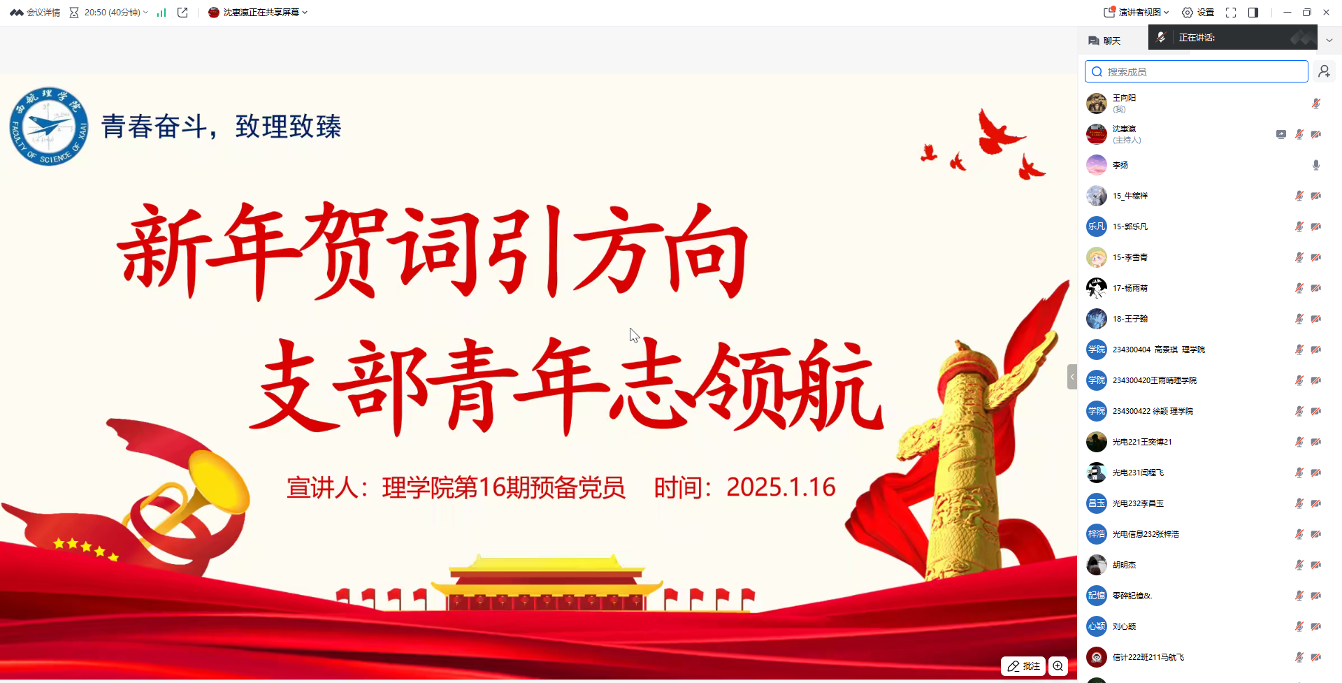 2025年1月16日beat365英国官方网站学生支部组织开展了以“新年贺词引方向,理院青年志领航”为主题的党日活动,学习习近平主席二〇二五年新年贺词,激励广大学生党员在新的一年里挺膺担当、奋发有为。支部全体党员参加,此次活动由组织委员王向阳老师主持。