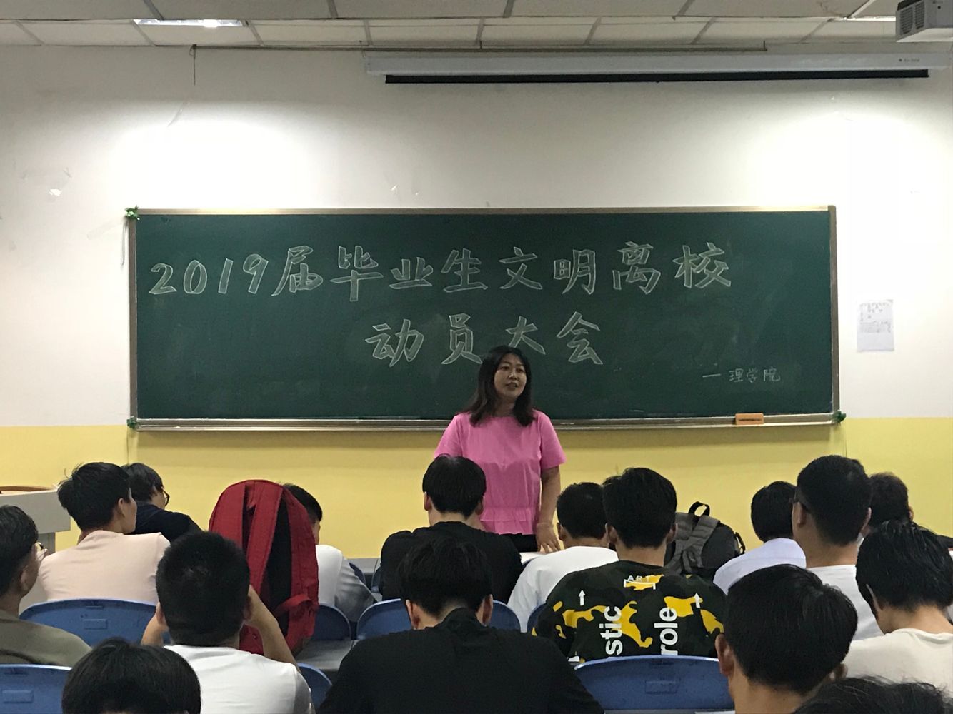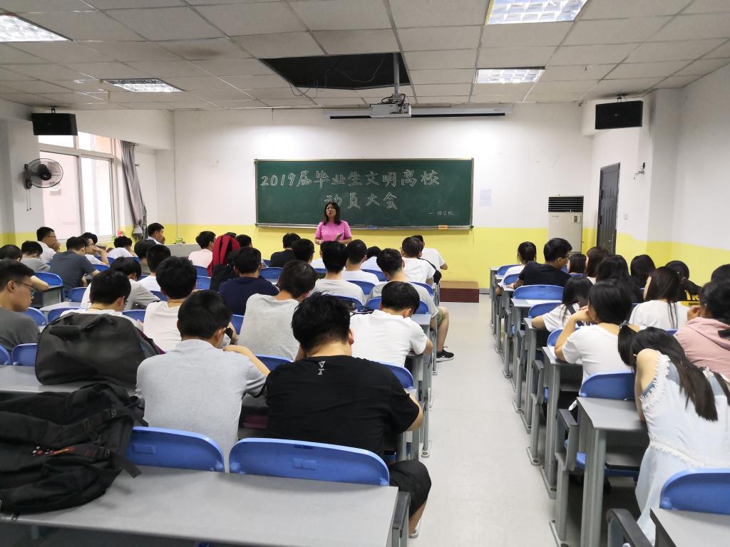 为提高毕业生文明离校意识,做好毕业生文明离校工作,6月13日19点30分,beat365英国官方网站在南楼408教室召开了2019届毕业生文明离校动员大会。beat365英国官方网站党总支书记李小光、学生管理科科长李扬、辅导员杨陈东和全体2019届毕业生参加了会议。会议由李扬主持。
