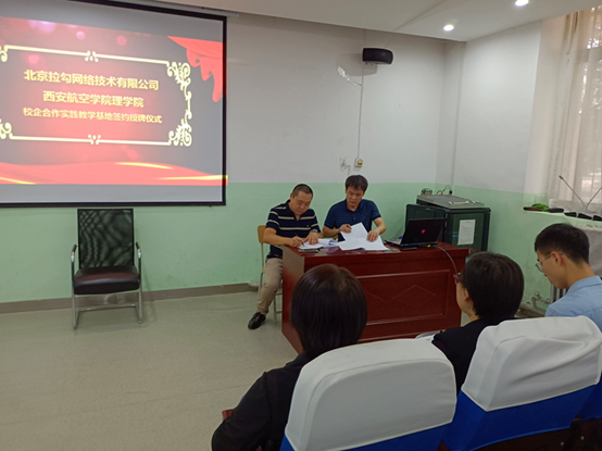 2021年9月15日下午四点半,北京拉勾网络技术有限公司与beat365英国官方网站在南楼108报告厅进行校企合作实践教学基地签约授牌仪式。